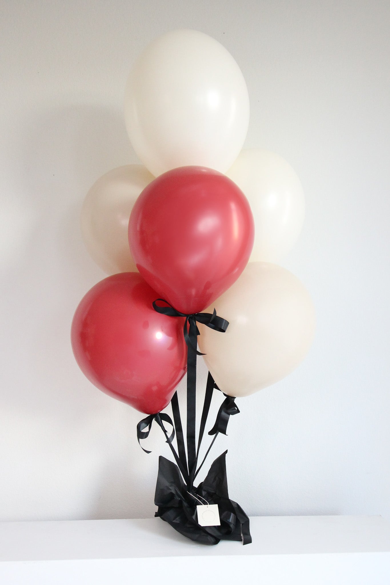 Be fearless with Little Rebel, a helium bouquet featuring a bold mix of red, tan, and white balloons, tied together with sleek black satin ribbon. Ideal for those who love a touch of rebellious charm, this bouquet is a showstopper at any event.